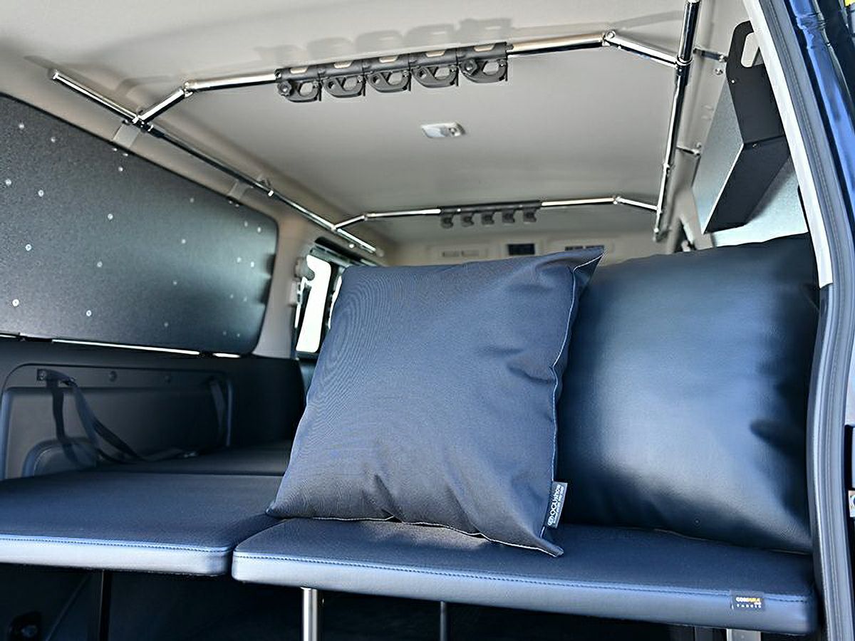 クッションの表面が耐久性・耐水性に優れたファブリック素材のCORDURA®Fabric生地、裏面がブラックレザー生地のコンビ仕様になります。車内でリラックスする際や、就寝時の枕として使用していただけます。