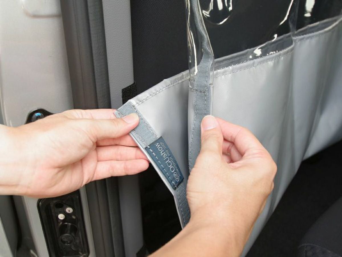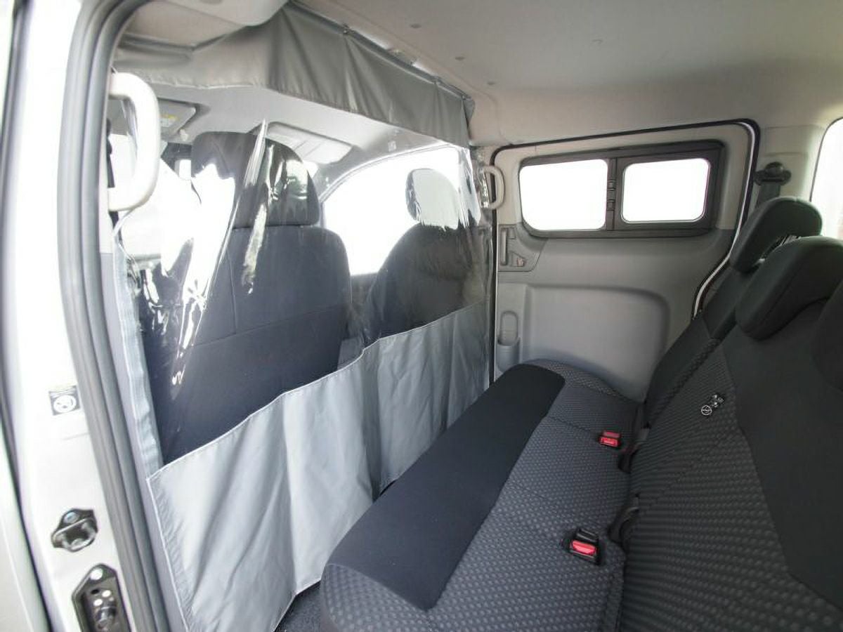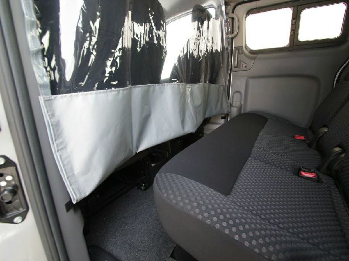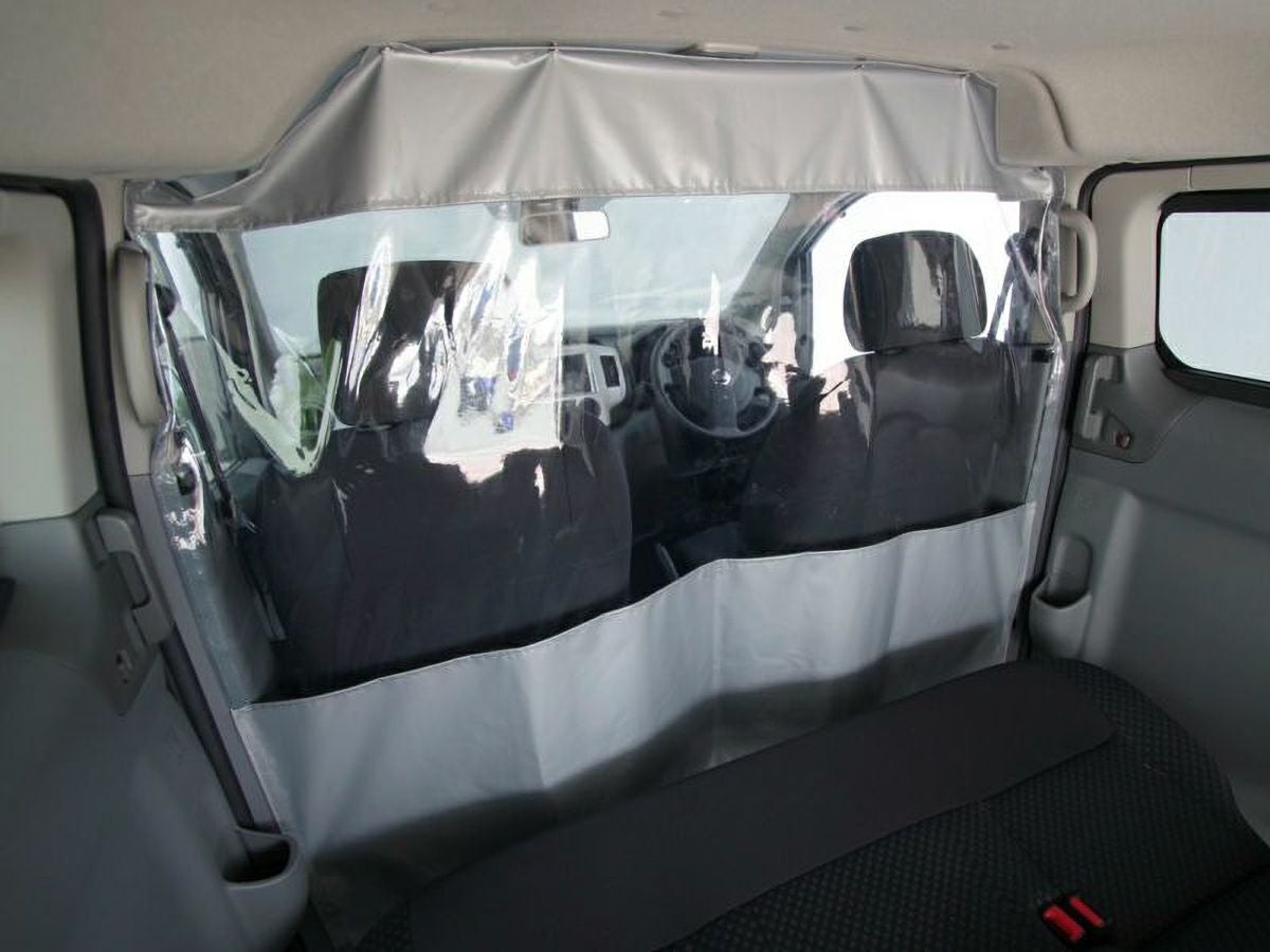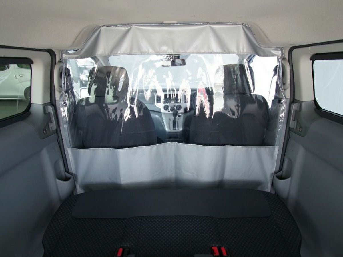 NV200バネットに取付け可能な感染症予防対策用の「仕切りカーテン」です。飛沫感染により人から人へうつるウイルスはさまざまです。送迎を行うバスやタクシーなどで、飛沫感染症対策としてフロントシートとリアシートを仕切ることができます。