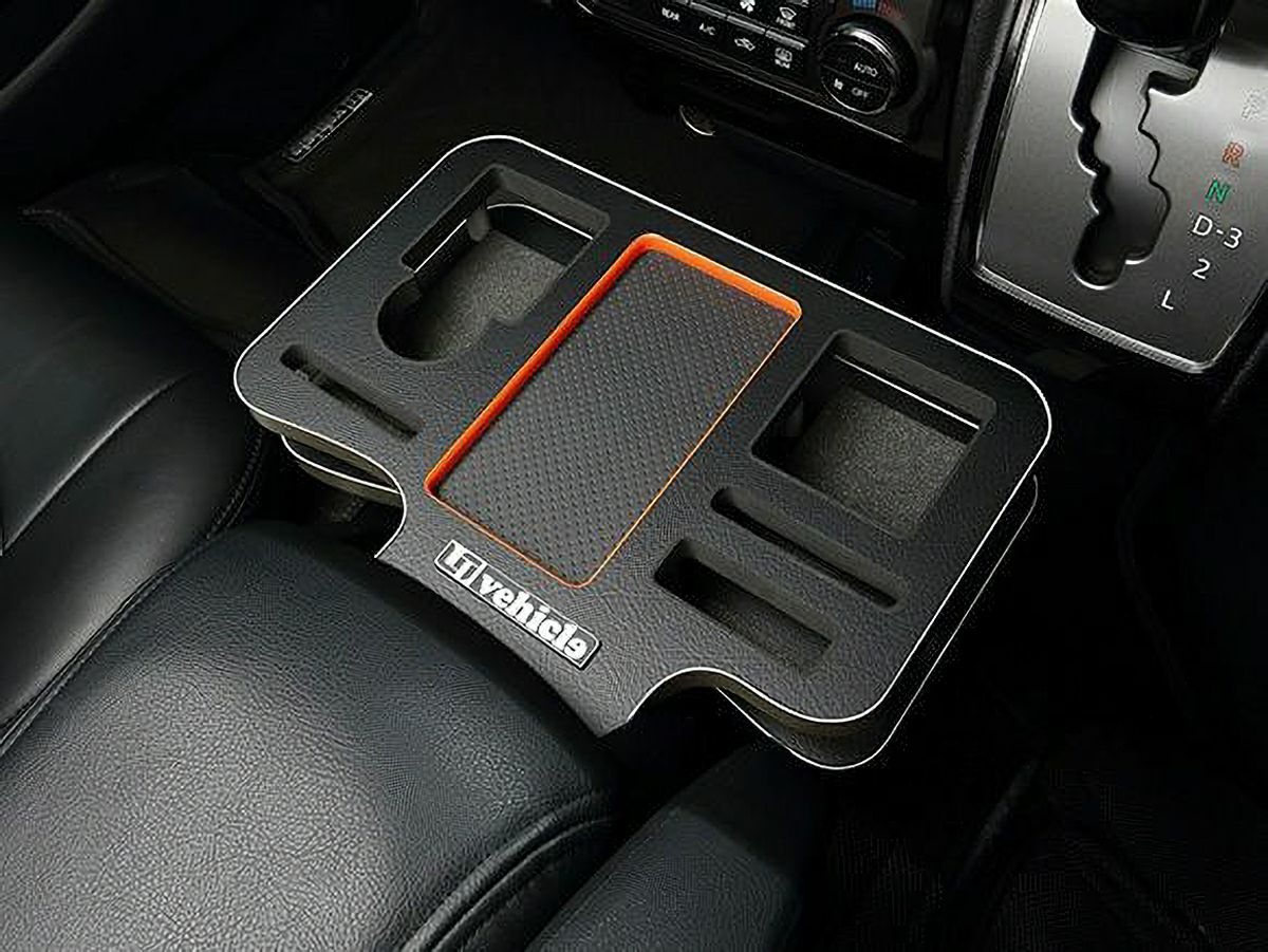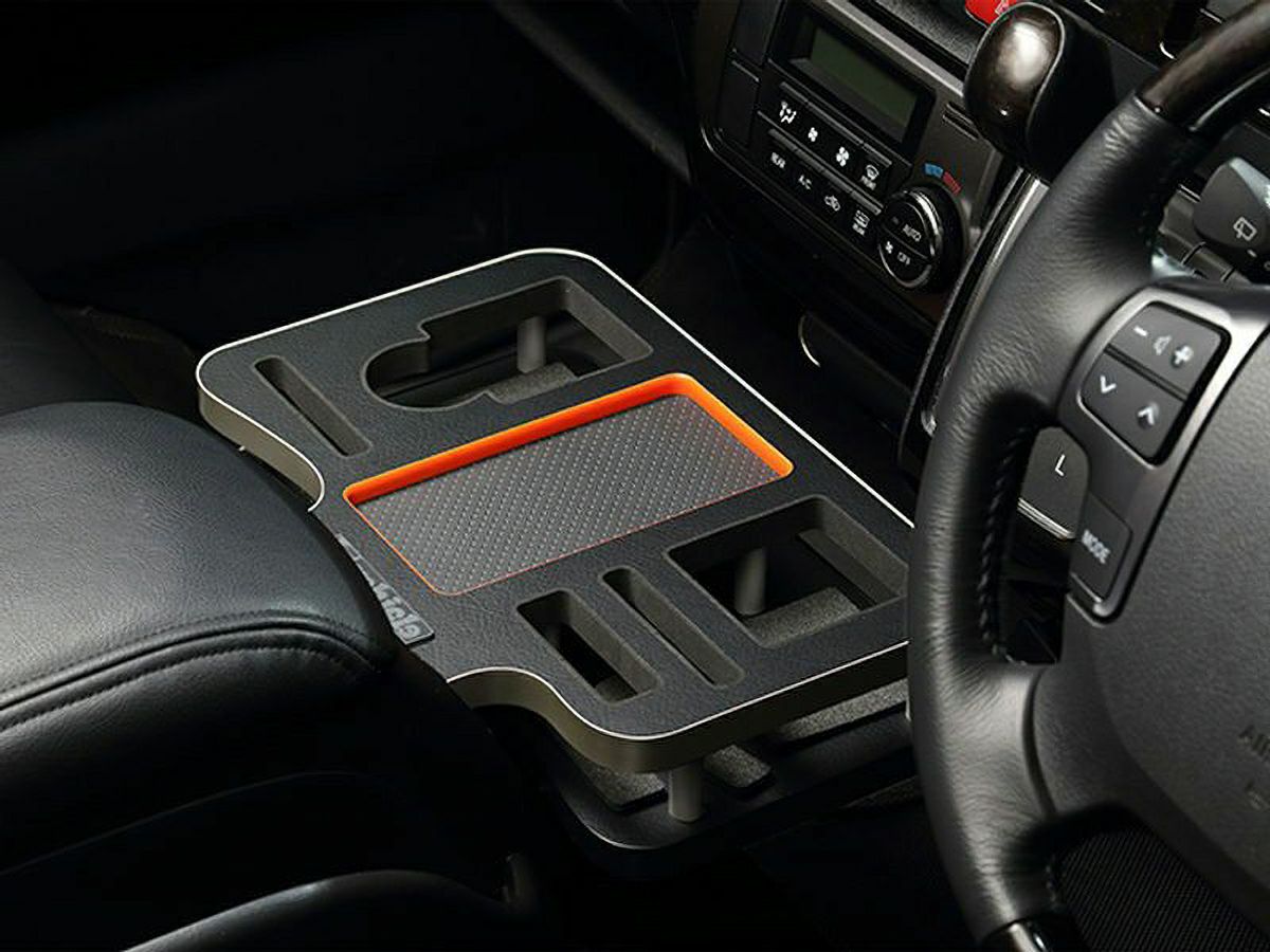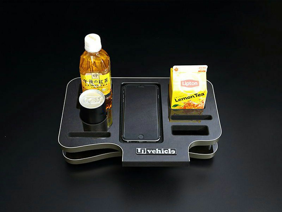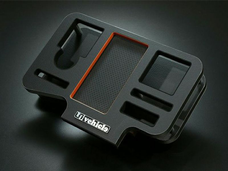 カラーは、レザーブラックと、4型から発売されたダークプライム近似色をラインアップ。純正カラーと一体化させながらもフロント回りの機能面を拡充。スリム缶やペットボトル、紙パックも置け、もちろんスマートフォンやタバコホルダーも完備。 さらに中央部には便利な小物入れもご用意。