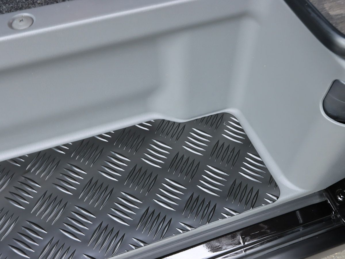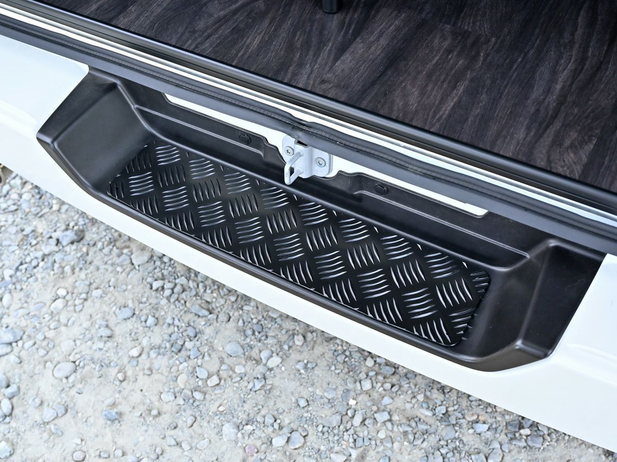 セカンドシートのサイドステップとリアゲートのステップに取付けるアイテムです。車輌に乗り降りする際に足をかけるステップ。様々な場所に出かけ、乗り降りが激しくなると、どうしてもステップの箇所が徐々に擦られて傷になっていきます。ステップ部分に、縞鋼板で作られたこのプロテクターを貼ることでステップを保護し、簡単にドレスアップすることができます。