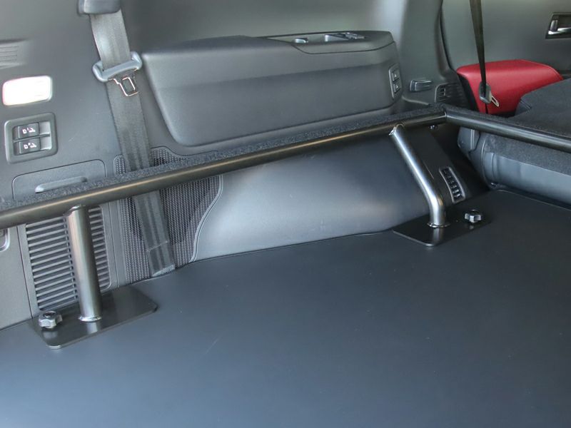 ラゲージスペースの積載容量を可能な限り減らさないように、トリム形状に沿ったベッドフレームを設計。フロアパネルと純正フックのボルト穴にボルトオンで取付けが可能です。ノブボルトで取付けることにより簡単に脱着も可能です。セカンドシートの快適性能を損なわないように、適度なシートリクライニングが可能となるようにフレームを設計をしています。セカンドシートを折りたたんでラゲージスペース使用する際には、フレーム前部に取付けられているサイドバーを取り外して使用してください。(ノブボルトで簡単脱着)