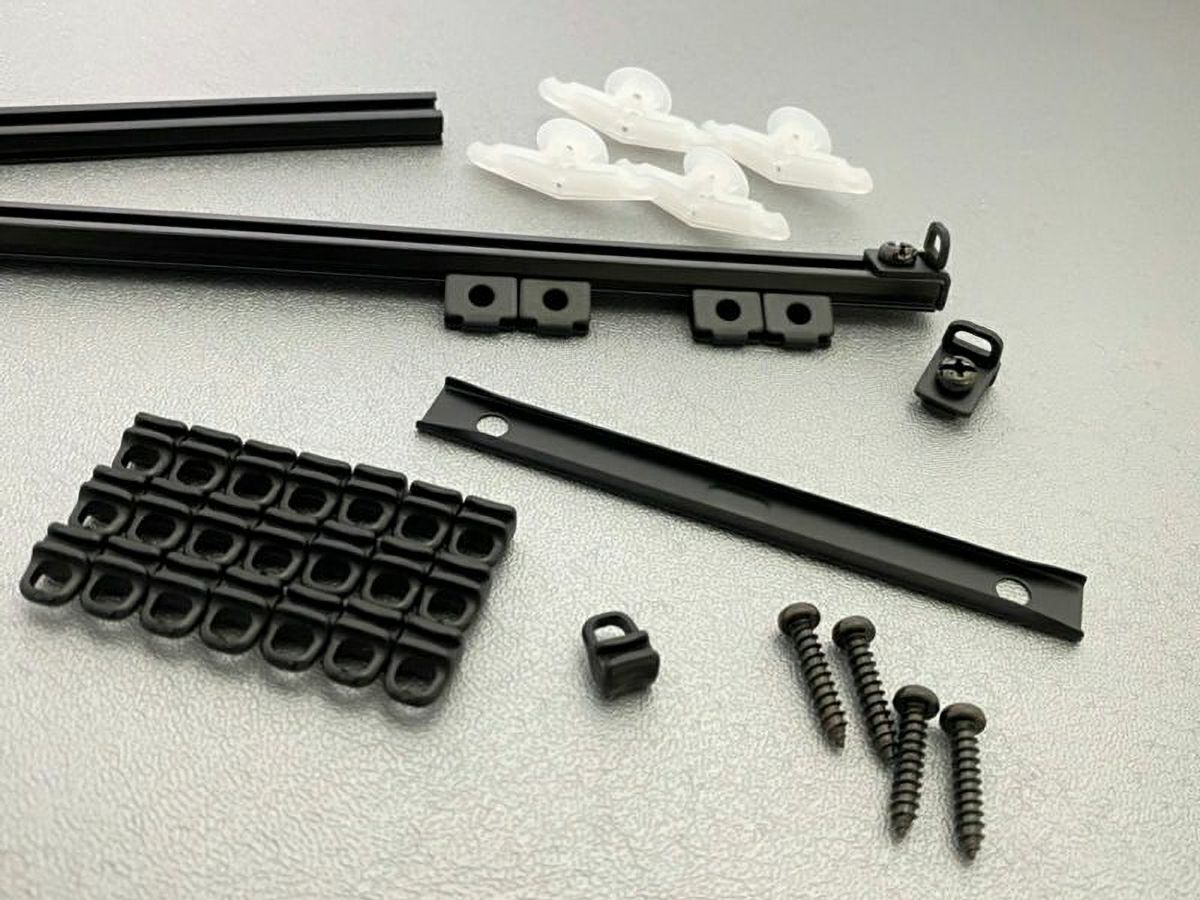 「汎用ブラックカーテンレール分割タイプ」は、レール本体はつや消しブラック。ランナーやビスなどの付属品も、見える部品はすべてブラックに統一したこだわり。200系ハイエース S-GLダークプライムグレードなど、ブラック内装のお車に最適です。ブラックのカーテンとの一体感を出して、愛車の内装により高級感を持たせ、自分好みにカスタマイズしていただけるようになりました。