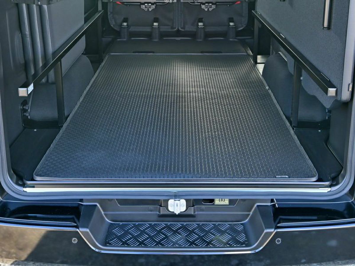 200系ハイエース標準ボディや、キャラバン(NV350)標準ボディの左右のタイヤハウス間にサイズを合わせて設計されたカーゴマットです。濡れた荷物も気にせず積める、防水性・耐久性に優れたエラストマー素材(TPE)を採用し、さらに、泥や水などの汚れが飛散しにくい構造の縁高モール(High Edge)で仕上げています。