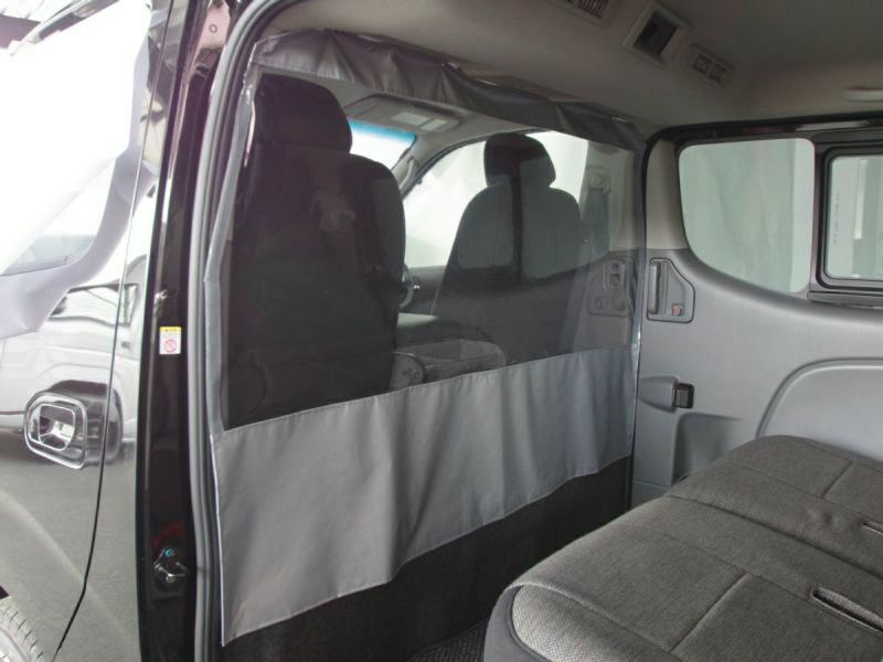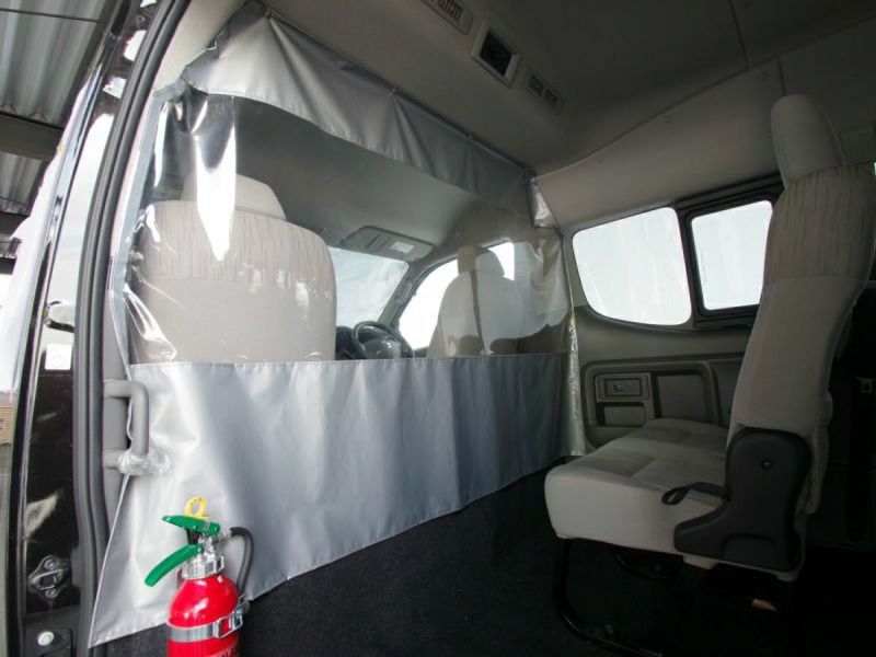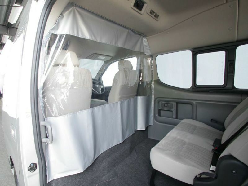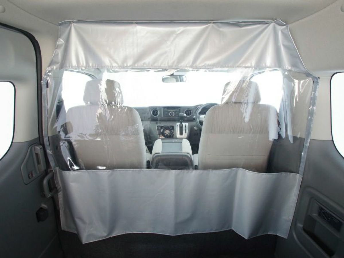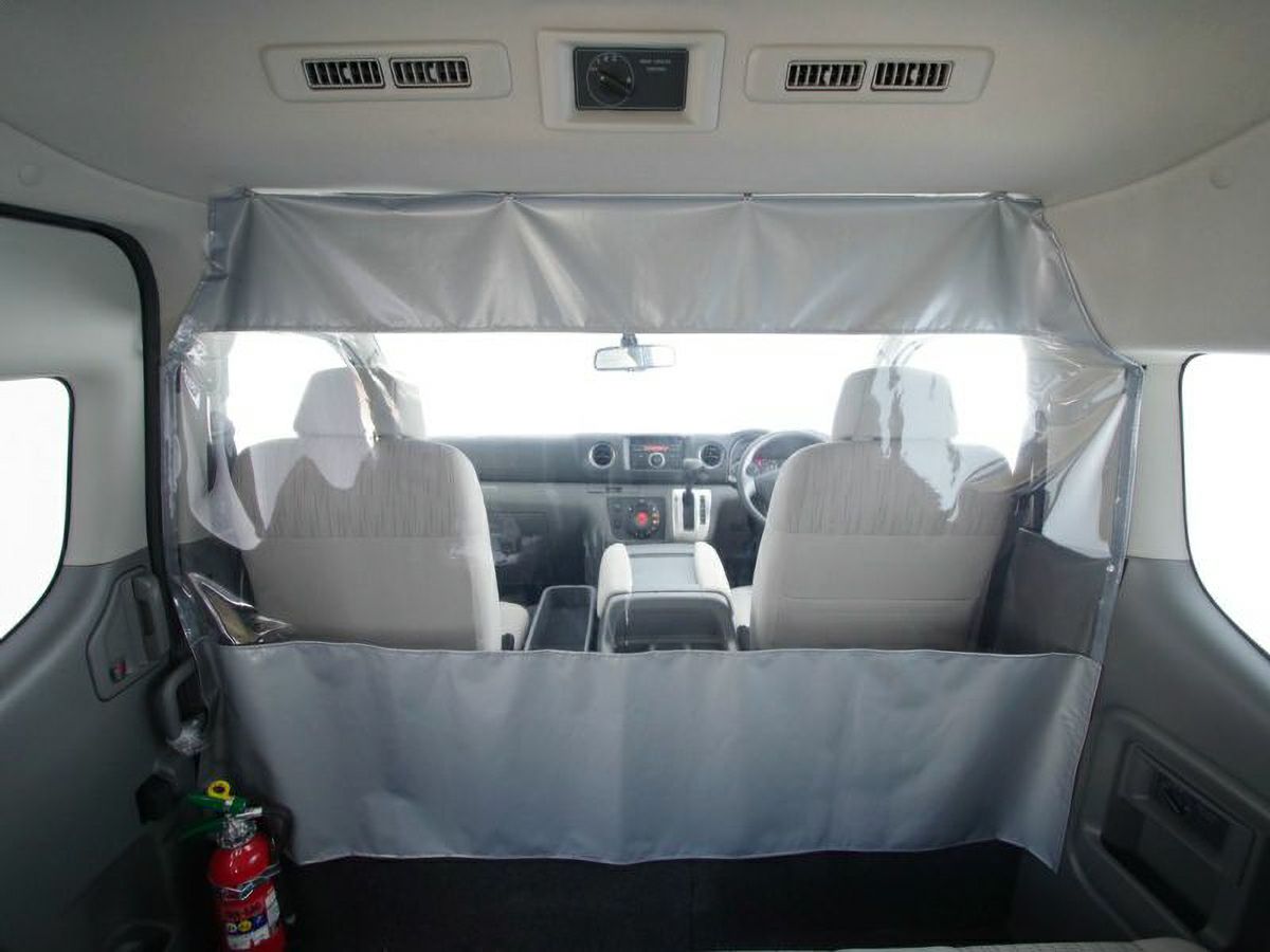 キャラバンに取付け可能な感染症予防対策用の「仕切りカーテン」です。飛沫感染により人から人へうつるウイルスはさまざまです。送迎を行うバスやタクシーなどで、飛沫感染症対策としてフロントシートとリアシートを仕切ることができます。