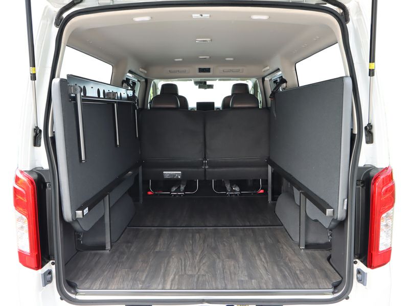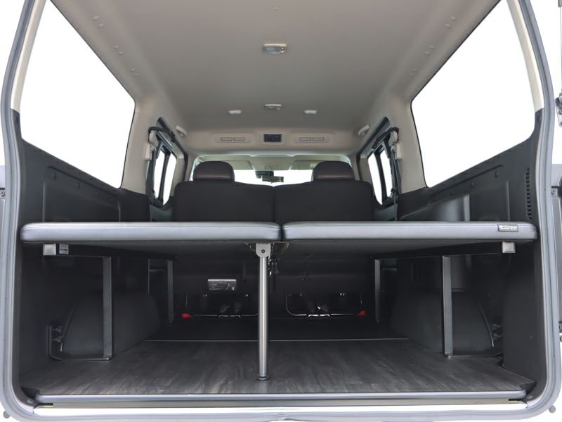両側のベッドを展開することで、ラゲッジルームを全面ベッドスペースとして使用できます。ベッドの展開は、マットを固定しているベルトを外して、ワンタッチで脚を出して置くだけで可能です。