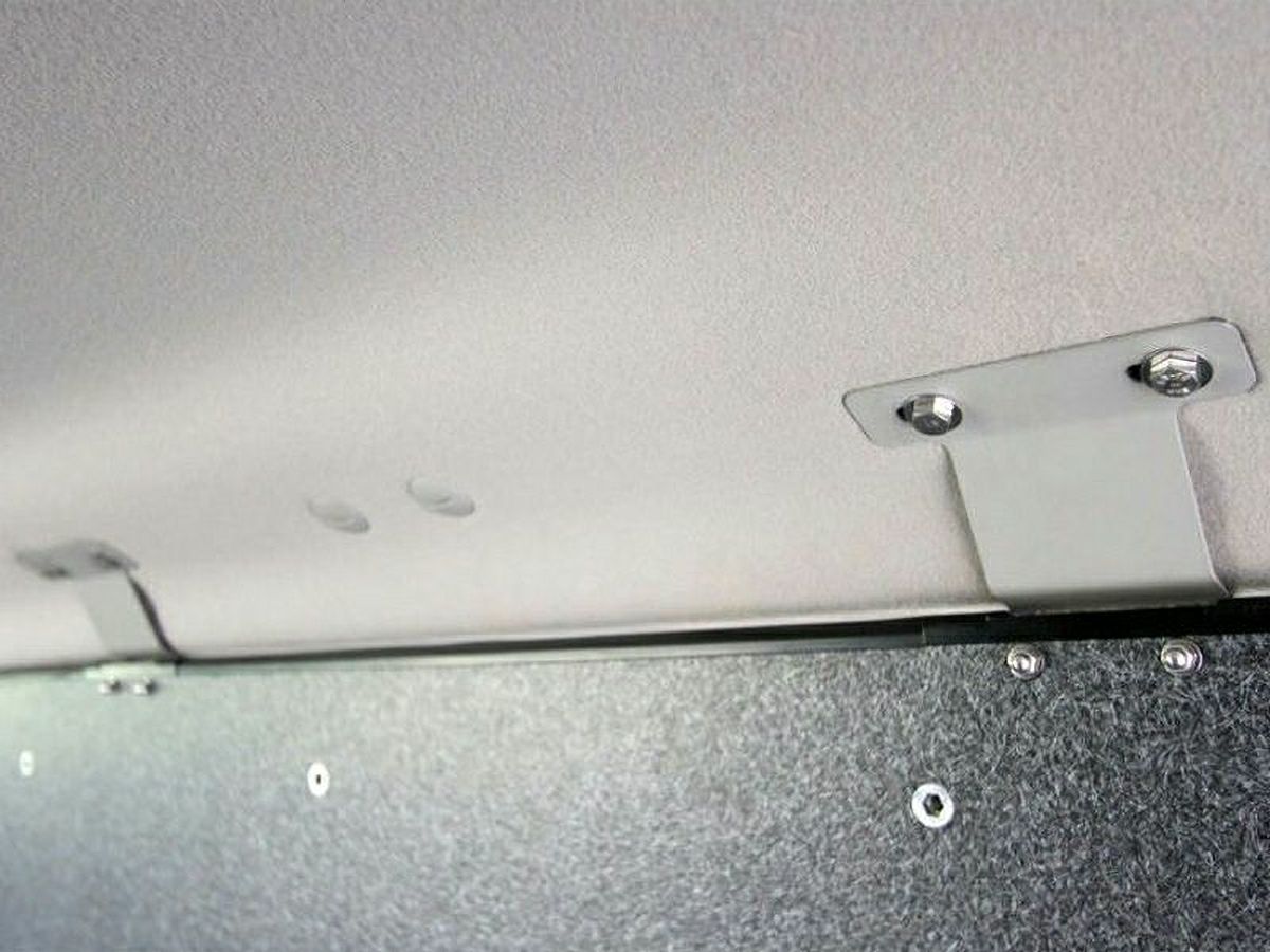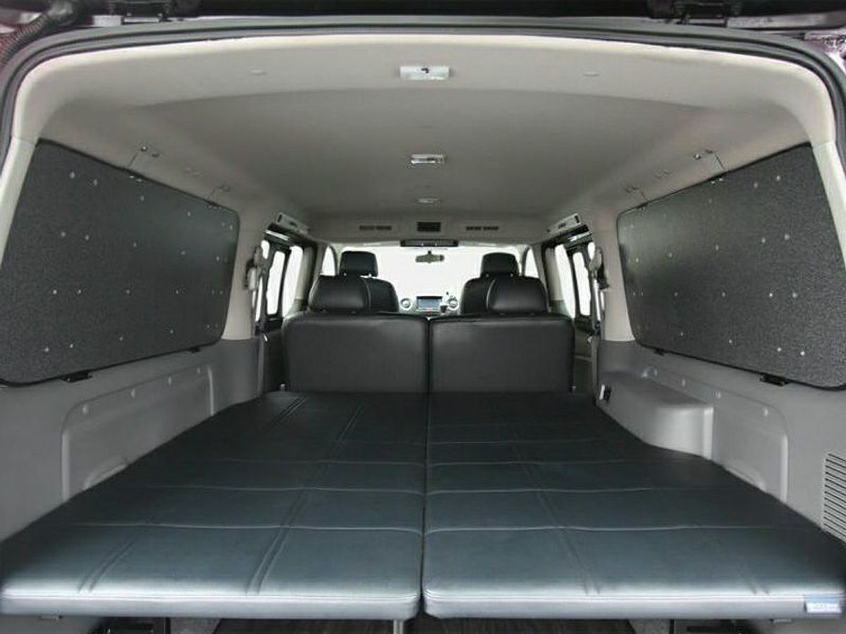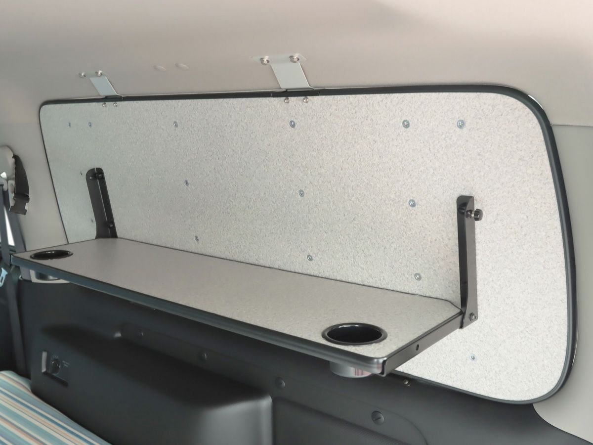 トランポの定番アイテムとして、窓を保護する役割だけでなく、装着することで、そこを収納スペースとして様変わりさせるトランポ必須アイテムです。パネルの周囲にモールを巻き、ボディに傷が付きにくくなるよう設計。さらに、裏面もクッションフロア仕上げとし、見た目も美しく、外からの遮光性も高まりました。