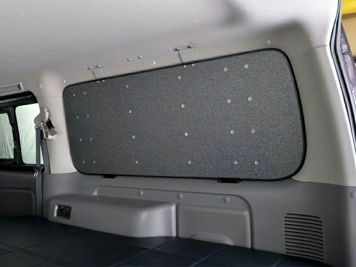 お仕事で荷物を積む時があるので窓の保護のために購入。加工が必要なのでオグショーさんで取り付けて貰いました。フロアパネルと色の相性バッチリで見た目の質感も上がり嬉しくなります。車中泊でも目隠しにも役立ちます。ボルト穴がたくさん付いているので車中泊に便利なカスタムパーツの取り付けに夢膨らみますね。