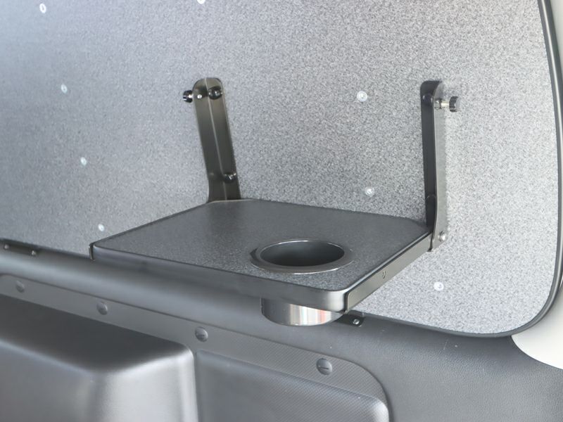 別売りの200系ハイエース用、もしくはキャラバン用ESウィンドウパネル(ナット有)に、工具不要でノブボルトだけで固定できるテーブル。車中泊や休憩時など、ベッドを使用する際に、飲み物やスマートフォンなどの小物を置くスペースとして最適です。カップホルダーが1個装備され、使用時に展開し、未使用時は、跳ね上げて収納できるフリップタイプです。