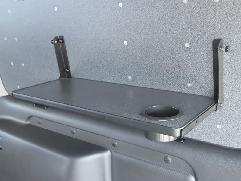 別売りの200系ハイエース用、もしくはキャラバン用ESウィンドウパネル(ナット有)に、工具不要でノブボルトだけで固定できるテーブル。車中泊や休憩時など、ベッドを使用する際に、飲み物やスマートフォンなどの小物を置くスペースとして最適です。カップホルダーが1個装備され、使用時に展開し、未使用時は、跳ね上げて収納できるフリップタイプです。