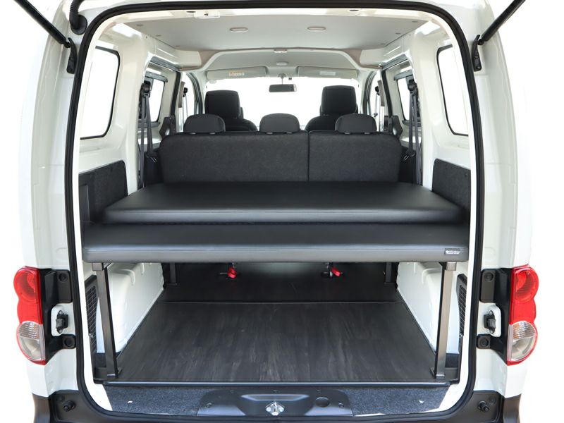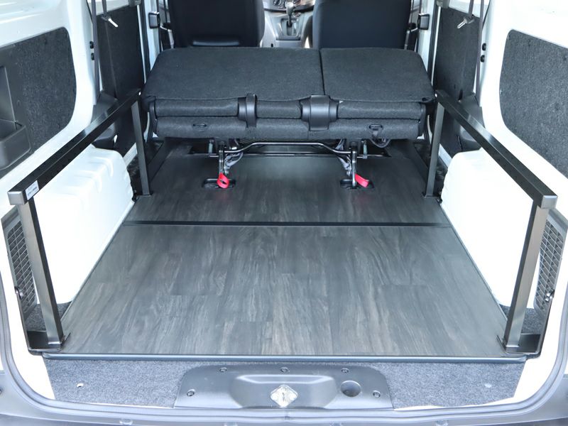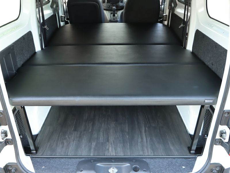 フロアパネルとフレームタイプのフラットベッドがセットになったNV200バネット バンGX専用のベッドシステムです。フロアパネルを置いた後、ラゲッジルームにある純正のユーティリティナットを使用し、付属のノブボルトで専用フレームを固定すれば、あとはベッドマットを上に載せるだけのシンプルな構成となっています。