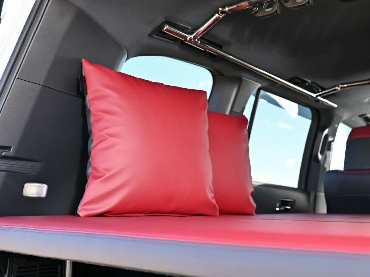 クッションの表面を、ランドクルーザー300 ESベッドシステムと同じく、上質なインテリアに沿った専用レザーを採用し、ダークレッド+ブラックレザー仕様で仕上げたクッションです。車内でリラックスする時のクッションとして、また、就寝時の枕として使用していただけます。