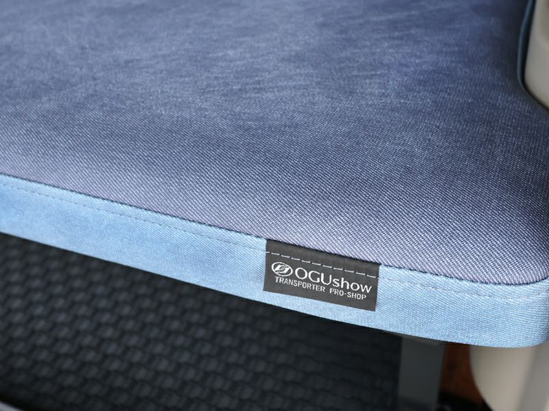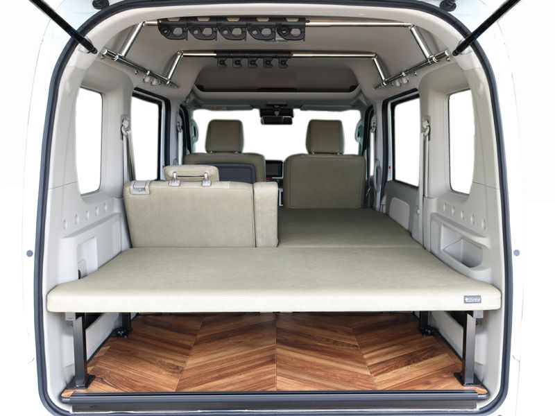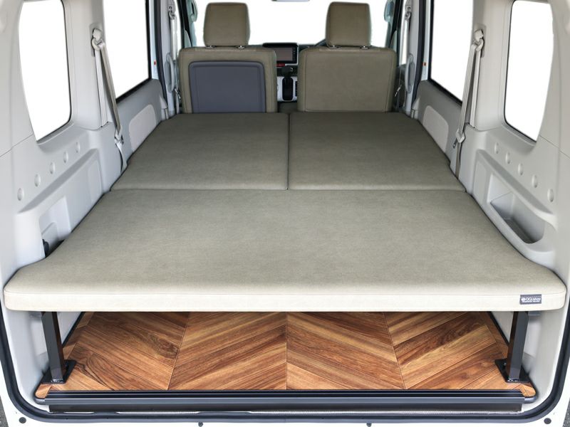 ベッドシステムの、設置、収納、ベッドアレンジ、を考え、ベッドマットは3枚に分割され、セカンドシートを前に倒しベッドマット2枚を載せることにより、簡単に全長 約1,810mm(最大幅 約1,270mm)のベッドの展開を可能にしました。マット生地にはデニム調のPVCレザー(ポリ塩化ビニール)を使用することで、水汚れにも強く実用性に優れた仕様ながら、やわらかな雰囲気を作り出します。