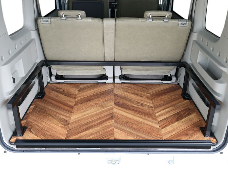 過酷な移動や使用状況でのベッドシステム(フレーム)の安定性を考え、フロアパネルをシステム化(セット化)しました。フロアパネルはラゲッジスペースのあらゆるタフな使用環境での耐久性を考え、硬質タイプのクッションフロアを採用。取付けはボデイへの特別な加工は必要とせず、「置くだけ」の簡単装着でトランポの基礎が完成します。