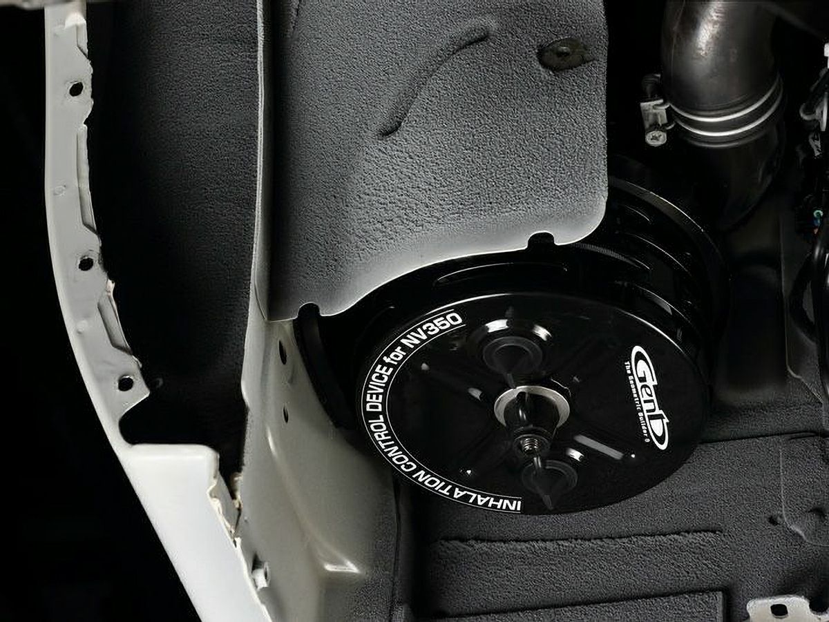 キャラバンの特徴でもある運転席ピラー部分の吸気ダクト。これは深い水溜りや未舗装路を走行した際に、水や砂埃の吸い込みを防止する目的で設けられています。しかし、日本の道路事情においては不要な装備ともいえるでしょう。そこで、ピラー部分の吸気ダクトを「クロージングパネル」でふさぎ、代わりにクリーナーボックスカバー側面に複数のスリットを新設。レイアウトを大胆に変更することで吸入効率の向上を試みたところ、狙いはズバリ的中し、まるで排気音かと疑うほどの豪快な吸気サウンドと、想定を上回るエンジンレスポンスを生み出すことに成功しました。