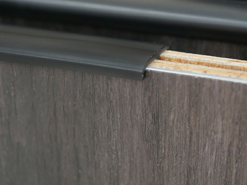 オグショーで製作するトランポのさまざまなアイテムに実際に使用されているこのTモール。反り方向にも曲げられます。このTモールをテーブルやフタのフチなどに使えば、仕上がりの質感がいっそう増します。