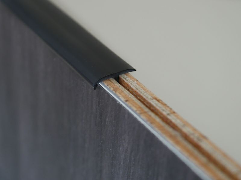 最低でも12mmの板の厚みが必要となります。(裏側に若干はみ出ます) それ以下の板ですとモールを取付けるための溝を掘ることが難しくなります。取付ける際にはモールを少し暖めると作業がスムーズになり、きれいな仕上がりになります。