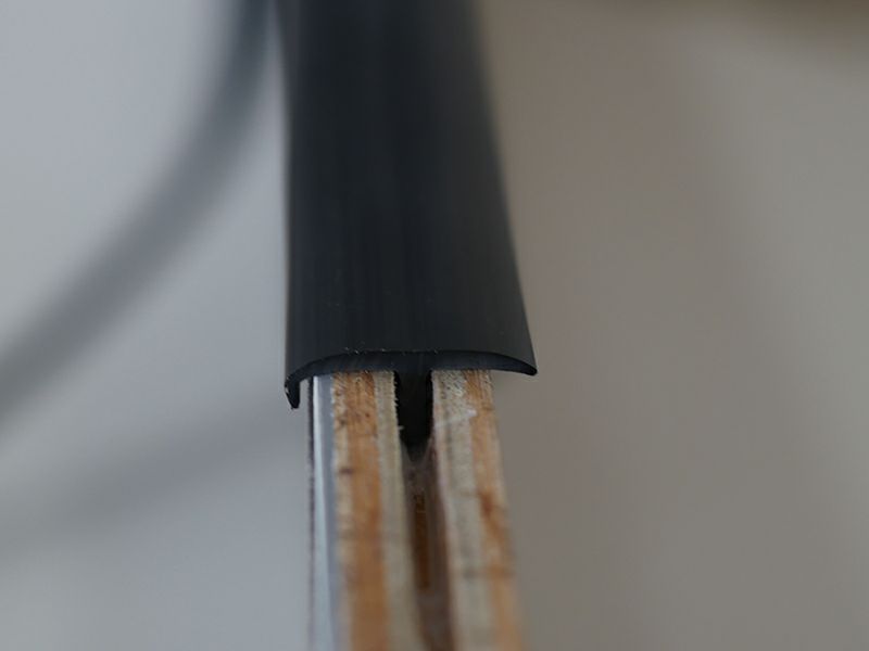 オグショーで製作するトランポのさまざまなアイテムに実際に使用されているこのTモール。反り方向にも曲げられます。このTモールをテーブルやフタのフチなどに使えば、仕上がりの質感がいっそう増します。