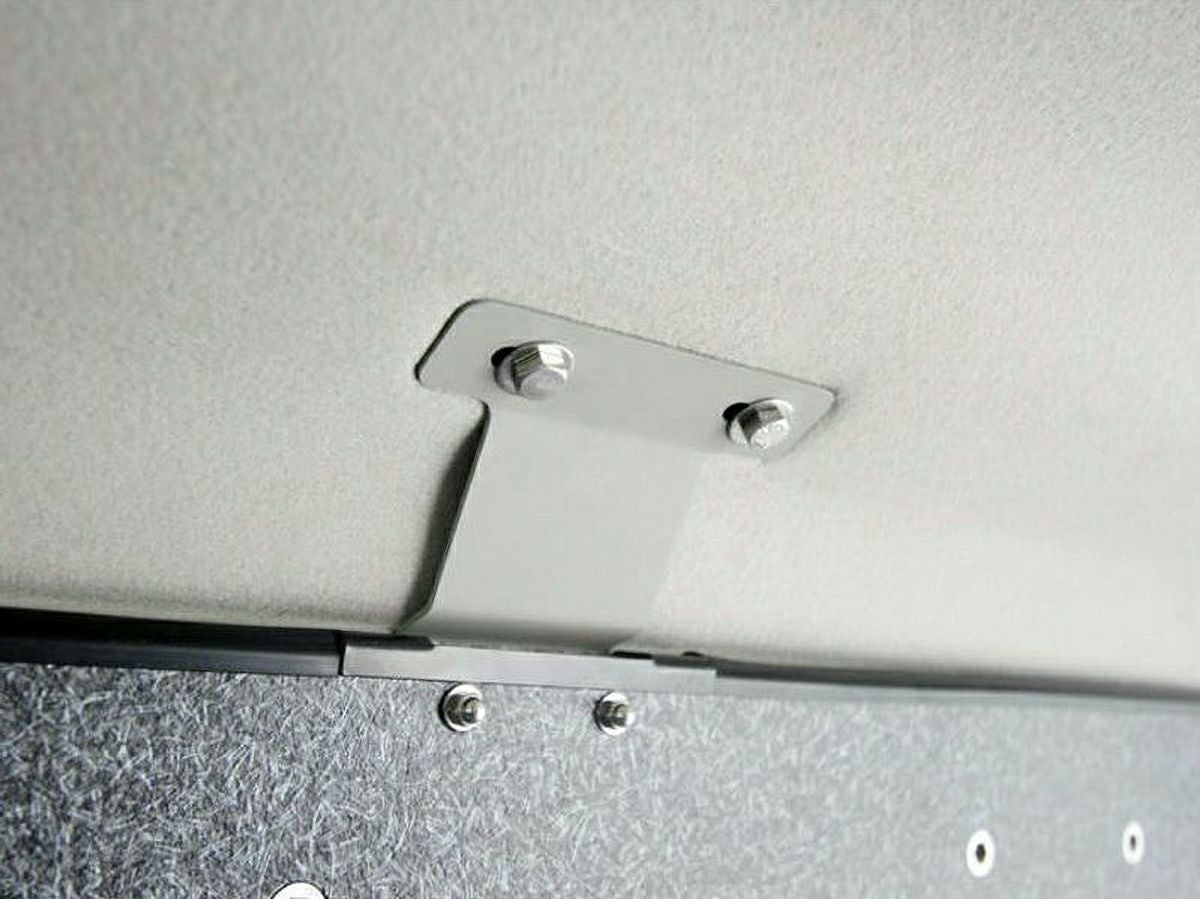 新たに開発されたキャラバン専用ステー。プレミアムGXの場合、上部はユーティリティナットを使用してボルトオンで固定。下部はボディに穴あけして固定します。いずれも、付属のボルトやビスで装着します。(バンDXの場合、上部もボディへの穴あけが必要です)