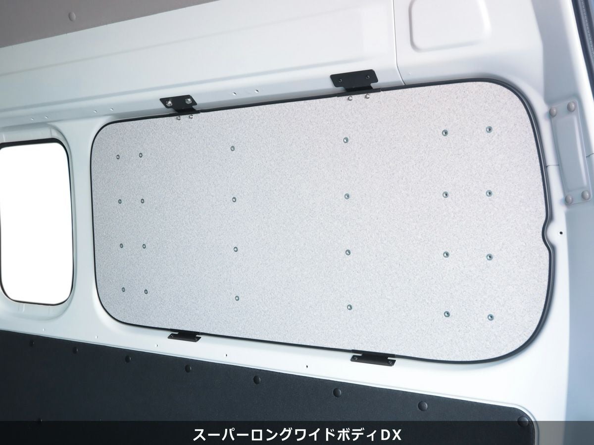 お仕事で荷物を積む時があるので窓の保護のために購入。加工が必要なのでオグショーさんで取り付けて貰いました。フロアパネルと色の相性バッチリで見た目の質感も上がり嬉しくなります。車中泊でも目隠しにも役立ちます。ボルト穴がたくさん付いているので車中泊に便利なカスタムパーツの取り付けに夢膨らみますね。