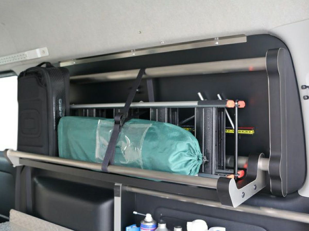 バイクを積載したときに出来るデッドスペースを有効活用。バイク横のデッドスペースを可動式にすることで、収納スペースへと活用できます。