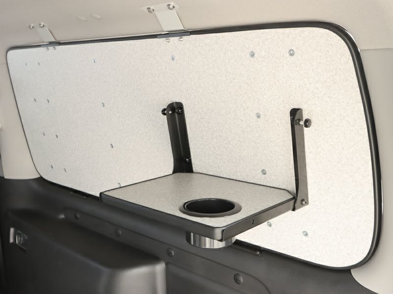 別売りの200系ハイエース用、もしくはキャラバン用ESウィンドウパネル(ナット有)に、工具不要でノブボルトだけで固定できるテーブル。車中泊や休憩時など、ベッドを使用する際に、飲み物やスマートフォンなどの小物を置くスペースとして最適です。カップホルダーが1個装備され、使用時に展開し、未使用時は、跳ね上げて収納できるフリップタイプです。