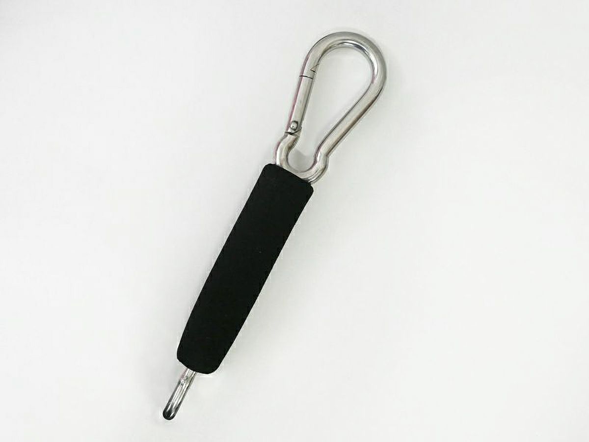 まず、ドアを開けた状態で、ボディのキャッチ部分に、ESボーンバーのカラビナを掛けます。