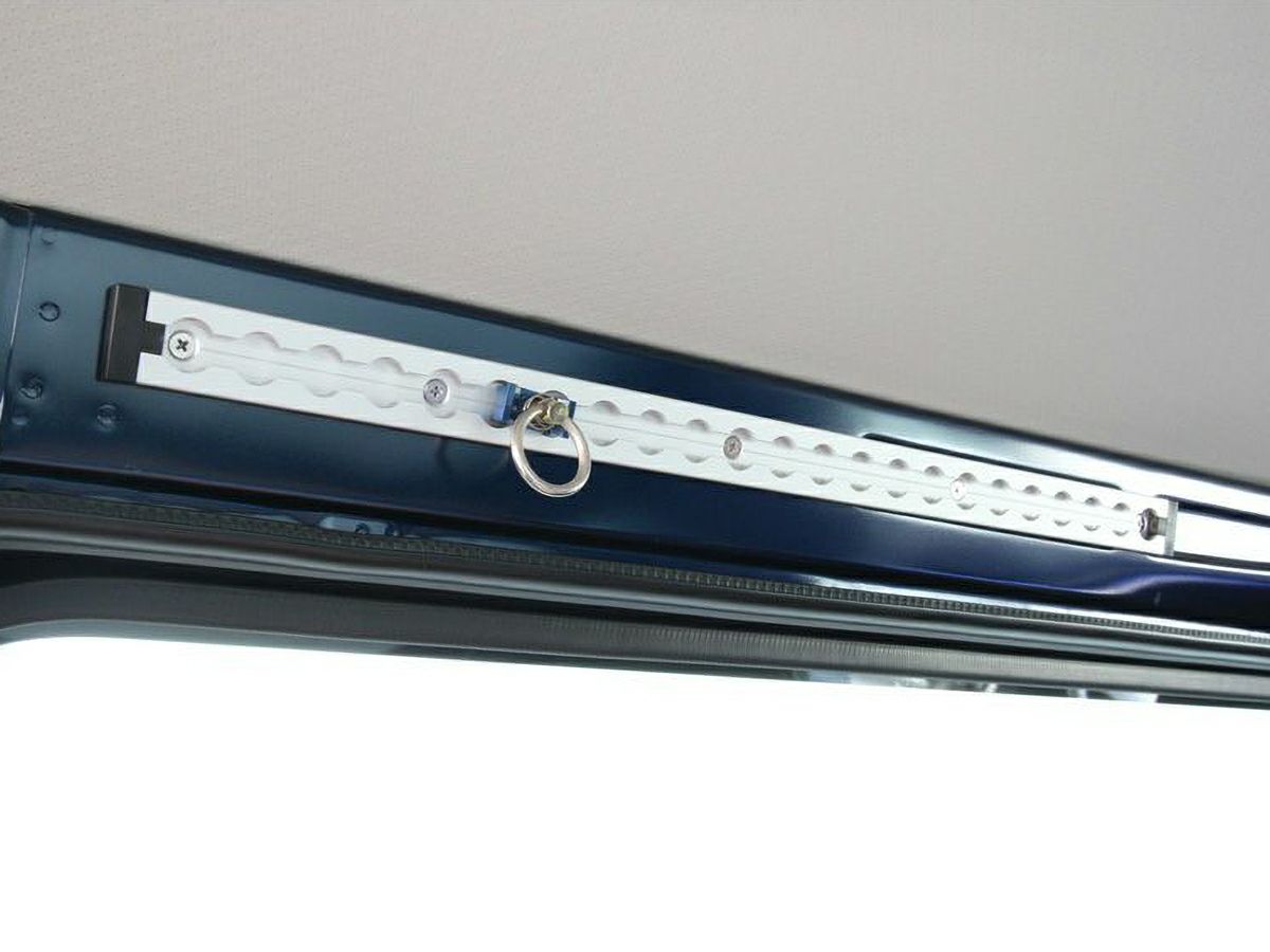 荷室の鉄板部分などにタッピングビスやボルト&ナットでレールを固定すれば、欲しいときに欲しいところへ別売りのワンタッチリングを取り付けて、ベルトなどで荷物を固定することができるようになります。