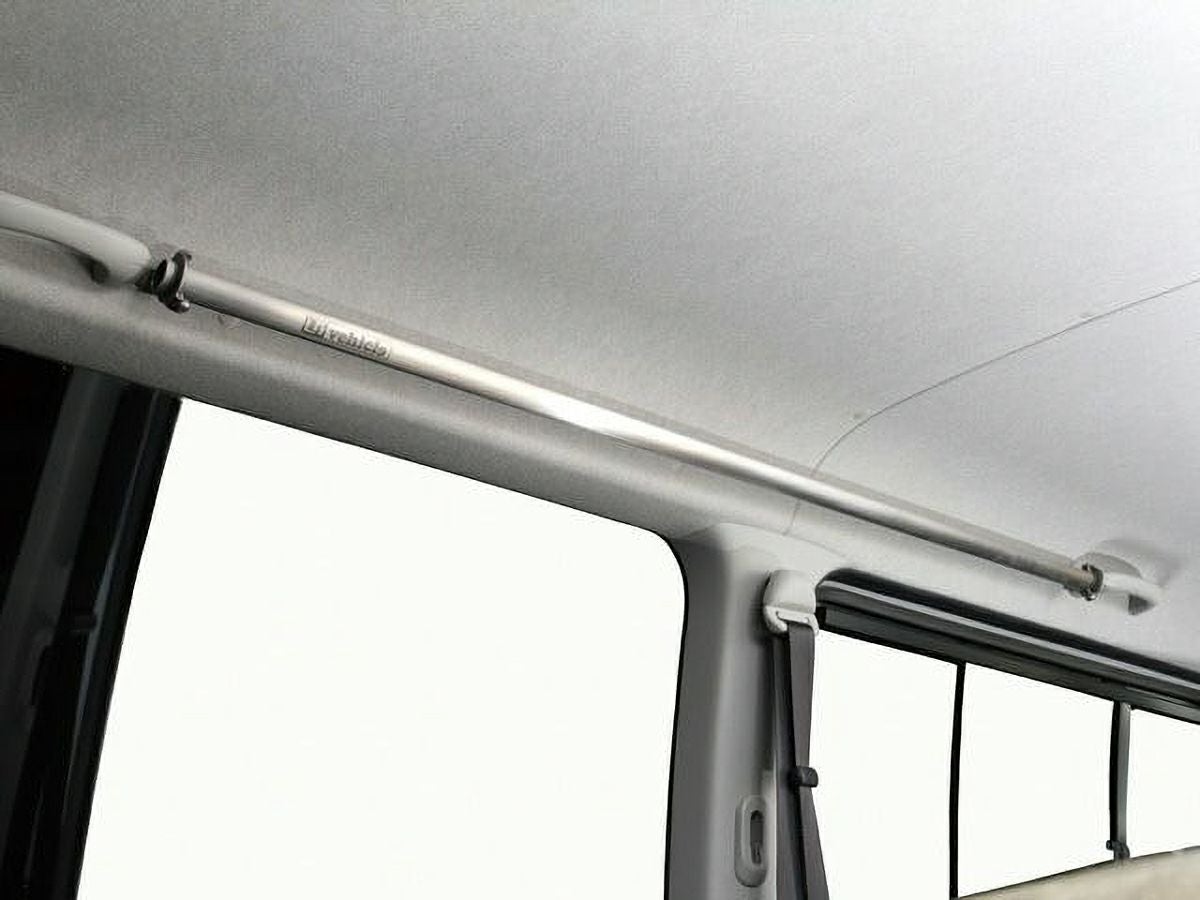 3列目に増設したアシストグリップと既存の2列目のアシストグリップを繋ぐステンレス製のバーです。アシストグリップを握った感じと同じ感じになるように、専用ステンレスブラケットと、専用ステンレス異形パイプを使用しています。ルームキャリアーを装着しても取付角度等は変わらずに前後にお好みの位置にスライド可能です。 また、2nd、3rdのアシストグリップ間もハンガーレールとして利用可能です。