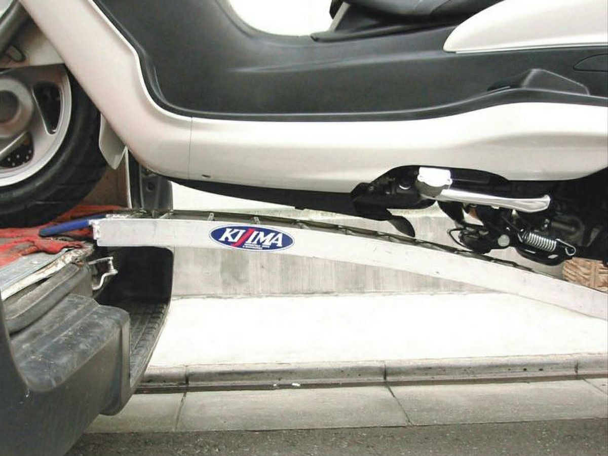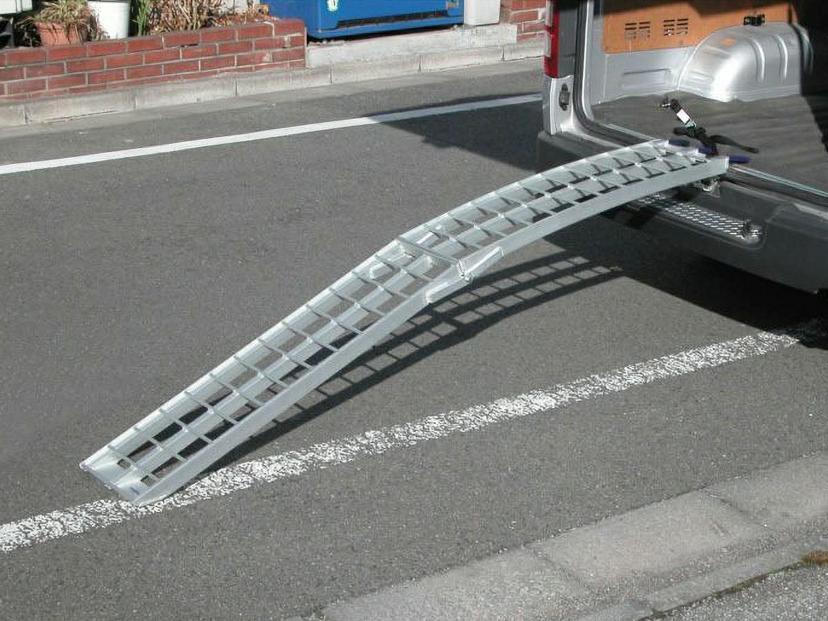 ストレートレールと比べ、軽くて場所もとりません。バイクを積載する時、フロントタイヤがアーチを越える辺りから軽くなり、安定する感じがとてもいいです。安定感は、降ろす時の方がもっとあると思います。ゆるやか感は女性ライダーにはウレシイかも。