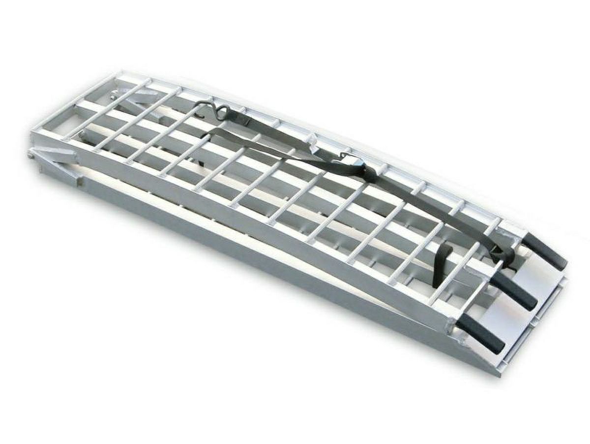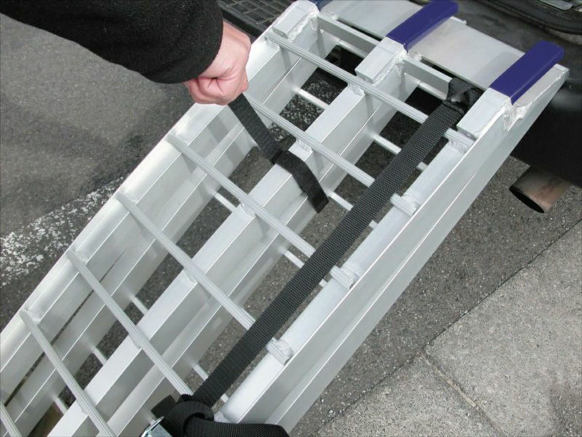 ハーレーや国産アメリカン等の車高の低い車輌でも底打ちしづらく、レーサーやオフロード車を頻繁に積載する方もストレートタイプと比較すると楽に積載できます。また、折りたたみ式ですので省スペースに優れます。脱落防止ベルト付属します。