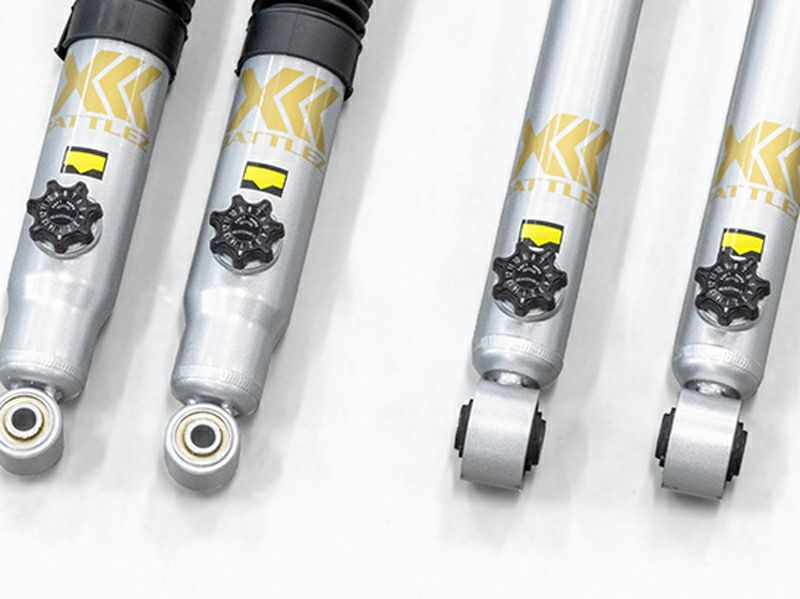 キャラバン E26系用の「BATTLEZ ダンパー AJ」。BATTLEZ ダンパーシリーズのひとつ「AJ」 シリーズは、低圧ガス封入ツインチューブダンパーに減衰力を気軽に調整できる14 段ダイヤルを備えた高性能ダンパーです。減衰力を“HARD”側に設定することで高速域や積載時の安定性がアップし、“SOFT”側に設定することでソフトな乗り心地を実現。走りや乗り心地にこだわるドライバーのシビアな要求に応えます。