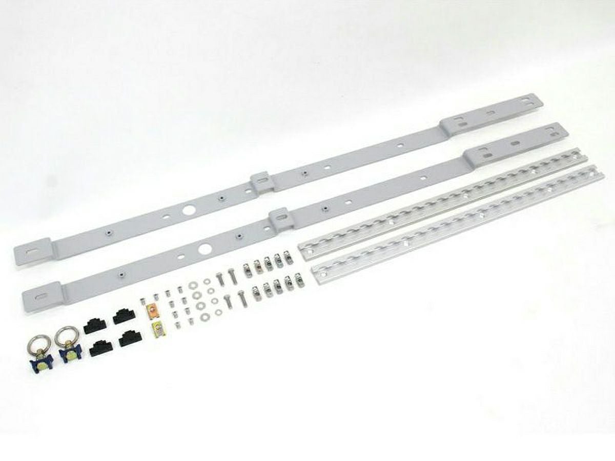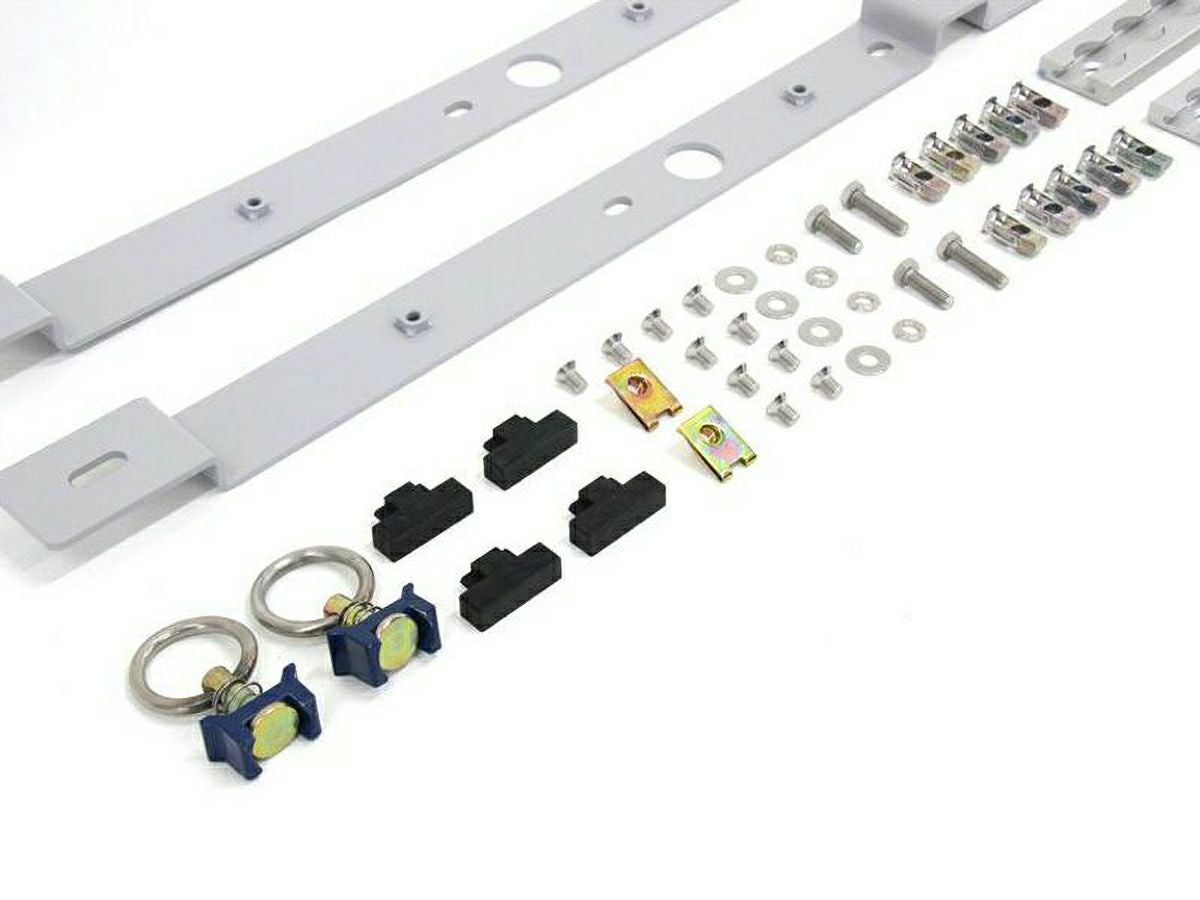 専用設計のステー(左右)に、ワンタッチレールを装着します。ワンタッチリングが2個付属します。もちろん、ワンタッチリングを追加で購入いただくことも可能です。取り付けに必要なボルトやターンナットなども付属します。一部穴あけ加工が必要となりますが、取付説明書も付属しますので、DIYが可能なアイテムです。
