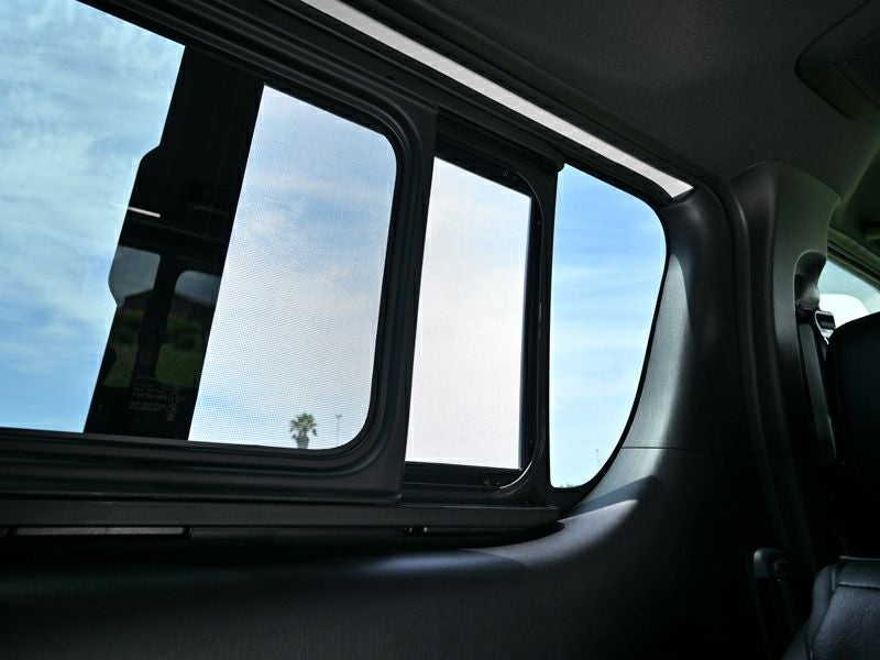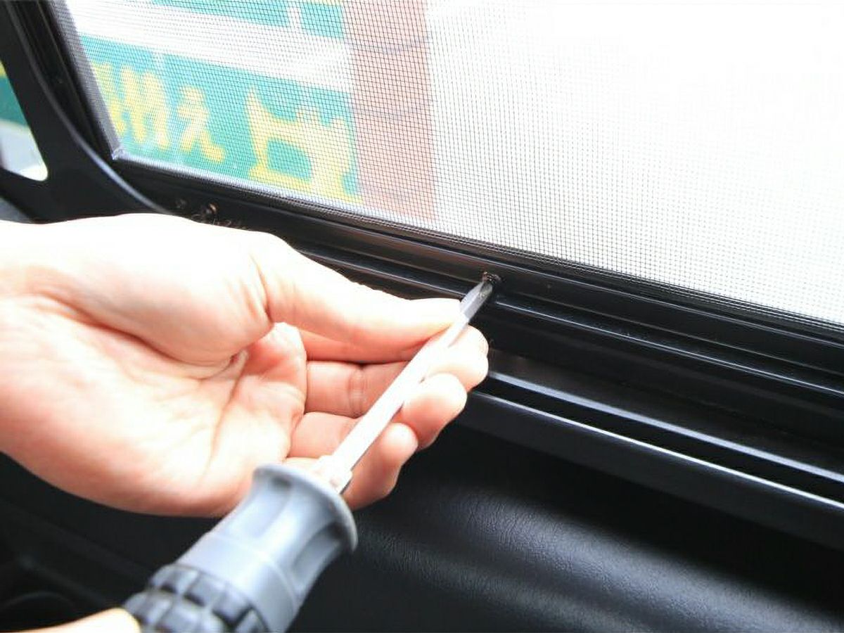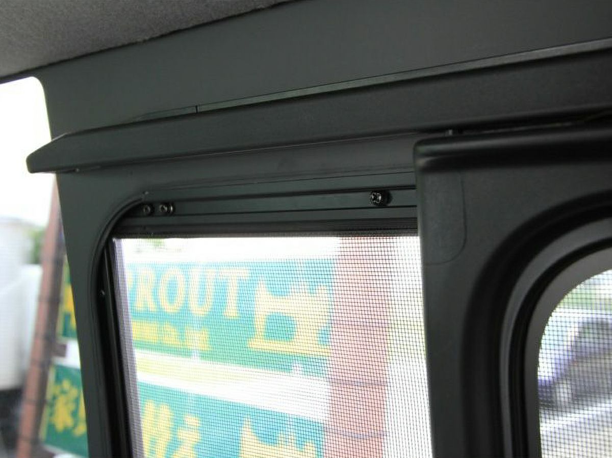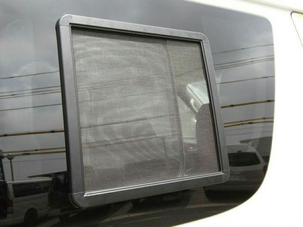 小窓に装着するこの網戸は、200系ハイエース4型以降の窓枠にピッタリはまるよう専用設計されています。しかも、取り付ける際にボディに加工は必要なく、内側から金具を使って固定するだけの簡単装着でプラスドライバー1本で固定できます。また、しっかり固定されていれば、そのまま走行が可能です。取り付けたままで窓の開閉ができるので、夜中の冷気や突然の雨などにも対応できる優れものです。もし網が破れても家庭用の網戸と同じように張り替えが可能です。