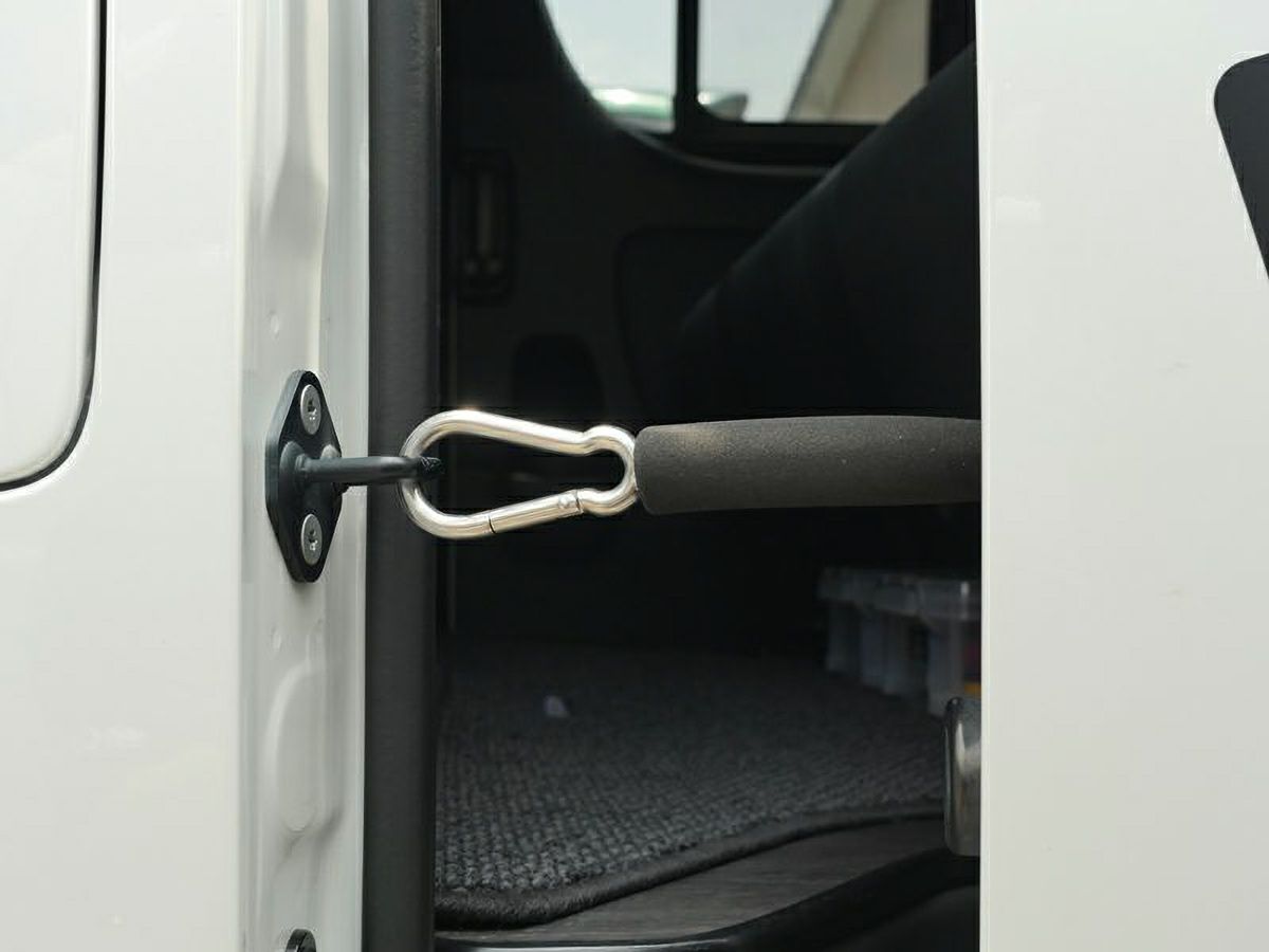 まず、ドアを開けた状態で、ボディのキャッチ部分に、ESボーンバーのカラビナを掛けます。