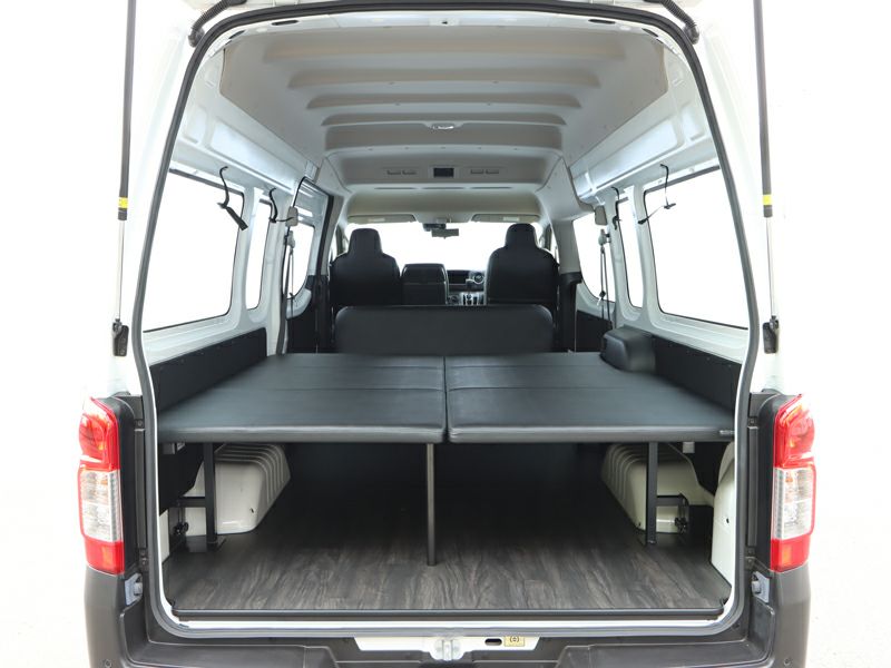 ラゲッジルームを可能な限り広く活用するために開発されたフレームタイプの跳ね上げ式ベッドキットにキャラバン スーパーロングワイドボディDX用がラインアップ。片面を跳ね上げた状態でも反対側をベッドとして展開できるため、バイクや自転車などの積載に最適なレイアウトとなります。もちろん、両側のマットを展開すれば、荷室全面をベッドとして使用できます。シチュエーションに合わせて使い方を変えられる、使い勝手抜群のベッドキットです。ESフロアパネルは必須ではありませんが、よりベッドが安定するため同時装着をお勧めします。 ※ESフロアパネルRは別売り