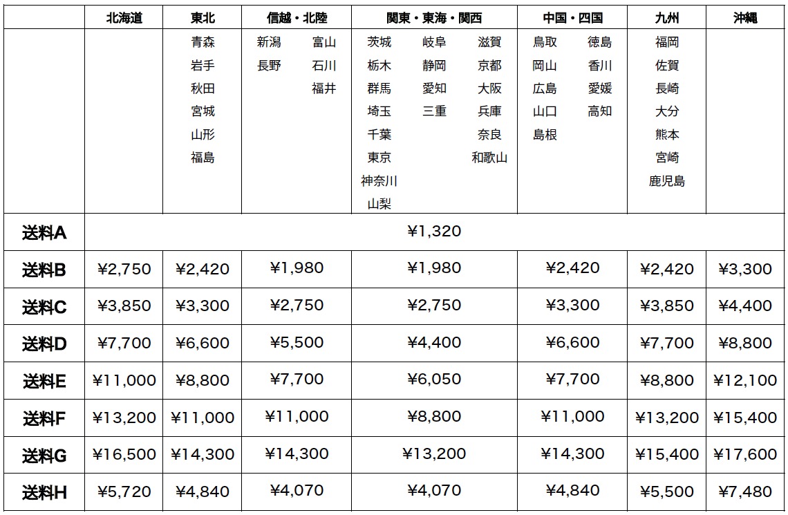 ※梱包配送料の一部として、当店が定める下記の料金設定に基づき、ご注文の際に送料を加算させていただきます。各商品ページには、「送料A」、「送料B」など、その商品の送料区分が明記されています。現在、送料区分は「送料A」から「送料H」まであり、その送料区分と商品のお届け先に応じて送料が決まります。