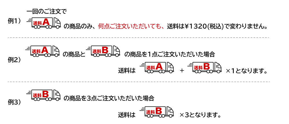※「送料B」から「送料H」が設定されている商品をご注文いただいた場合、各送料が商品点数分、加算されます。